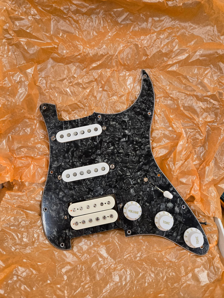 Here we have Two of our '62 spec single coils paired with a PAF wound to create the perfect blend between humbucker and single coil! To help you squeeze every drop of tone from this configuration the wiring schematic was designed to allow the bridge pickup its own tone control unlike standard strat wiring. This custom-made Volume/Tone (neck, middle)/ Tone(bridge) wiring harness features Two vintage NOS PIO capacitors. A Sprague cap contours the Neck/middle tone, and a Russian military grade capacitor contours the bridge pickup. Black Pearl pickguard and white bobbins are the icing on the cake! Don't miss your chance at this one-off Stocktone creation!